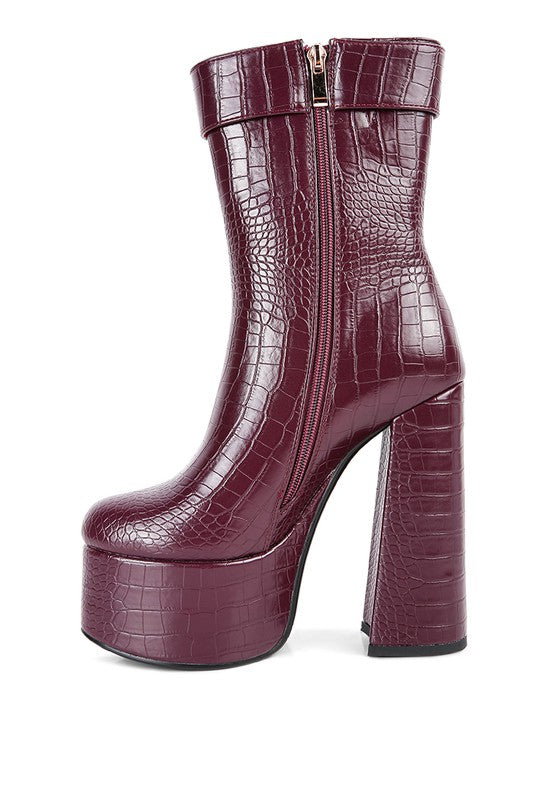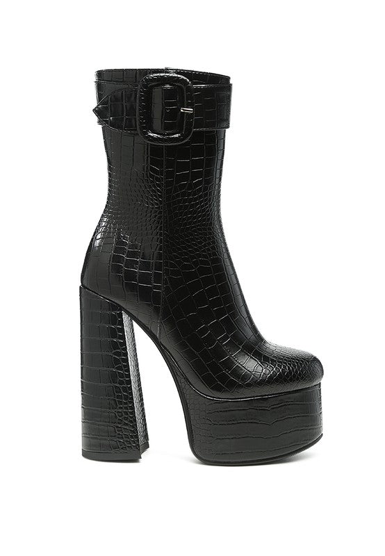 High Heel Statement Boot in showy block heels. In croc textured man made leather, the ankle boot has buckle details and is to pump all winter looks.