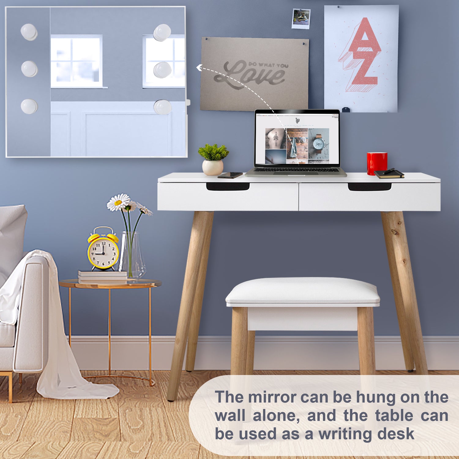 - Easy to install.You just need attaching the legs to the vanity, then fix the LED mirror. By the way, you can remove the mirror to use as a writing desk. The mirror can be used on the wall.