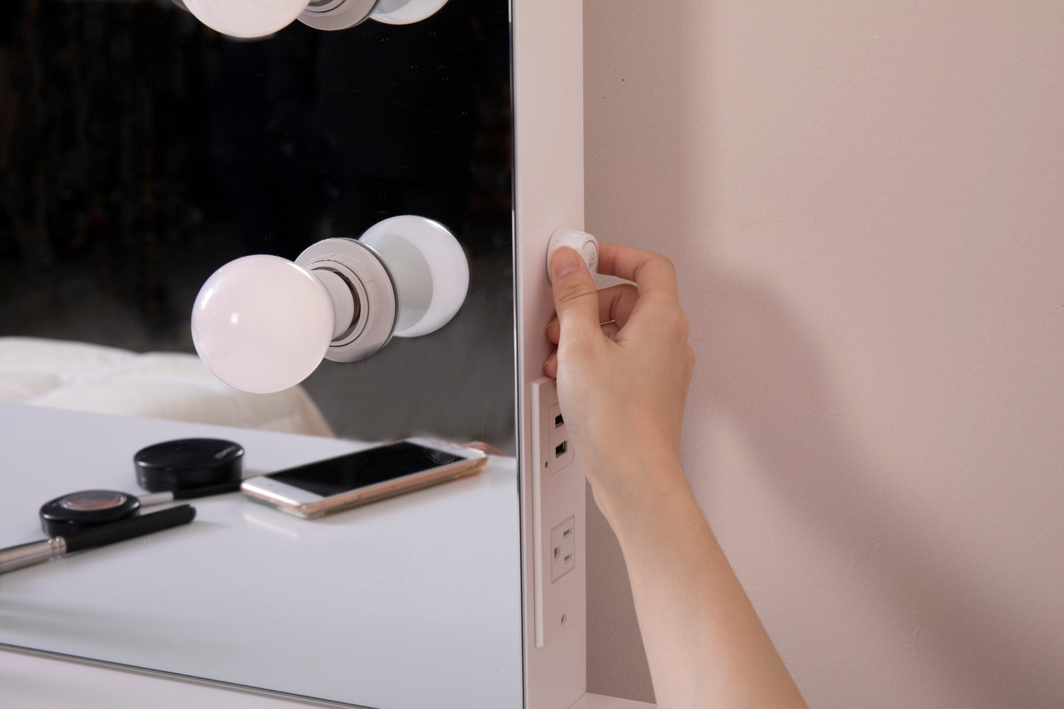 For women and girls, having such a dressing table with Hollywood makeup mirror is their own dream. Why stars must use such a make up table to makeup? Light projection in the face of the light enough, will not form a shadow, on the makeup to ensure uniform color. And you can use the mirror to makeup in the dark condition. Using dimmable LED bulbs, you can adjust the brightness of the bulb according to your needs, soft lighting, easy makeup surround type distribution can full fill light. It can show the most beautiful you. It is an energy-saving LED light bulb, saving electricity, fashion and environmental protection. Adopting ETL standard socket & Turn knob type dimmer, so please feel assured and safe to use it. The socket is set on the side, which can be used for the blowpipe, straight hair bar, etc. There are two USB plugs for charging mobile phones and tablets. Table leg is solid wood material, firm and durable, mirror part is silver mirror, clarity is high. Have a large space to store and organize your jewelry, makeup, etc. Beautiful line and smooth, stable design, beautiful and saving. Every Girl wishes to have a glamorous dressing table with all her jewelry and make up. Don't hesitate. This white vanity table set comes with mirror, bulbs and storage drawers. Powerful storage capacity is great for storing all your jewelry. Elegant look compares well with your furniture.
