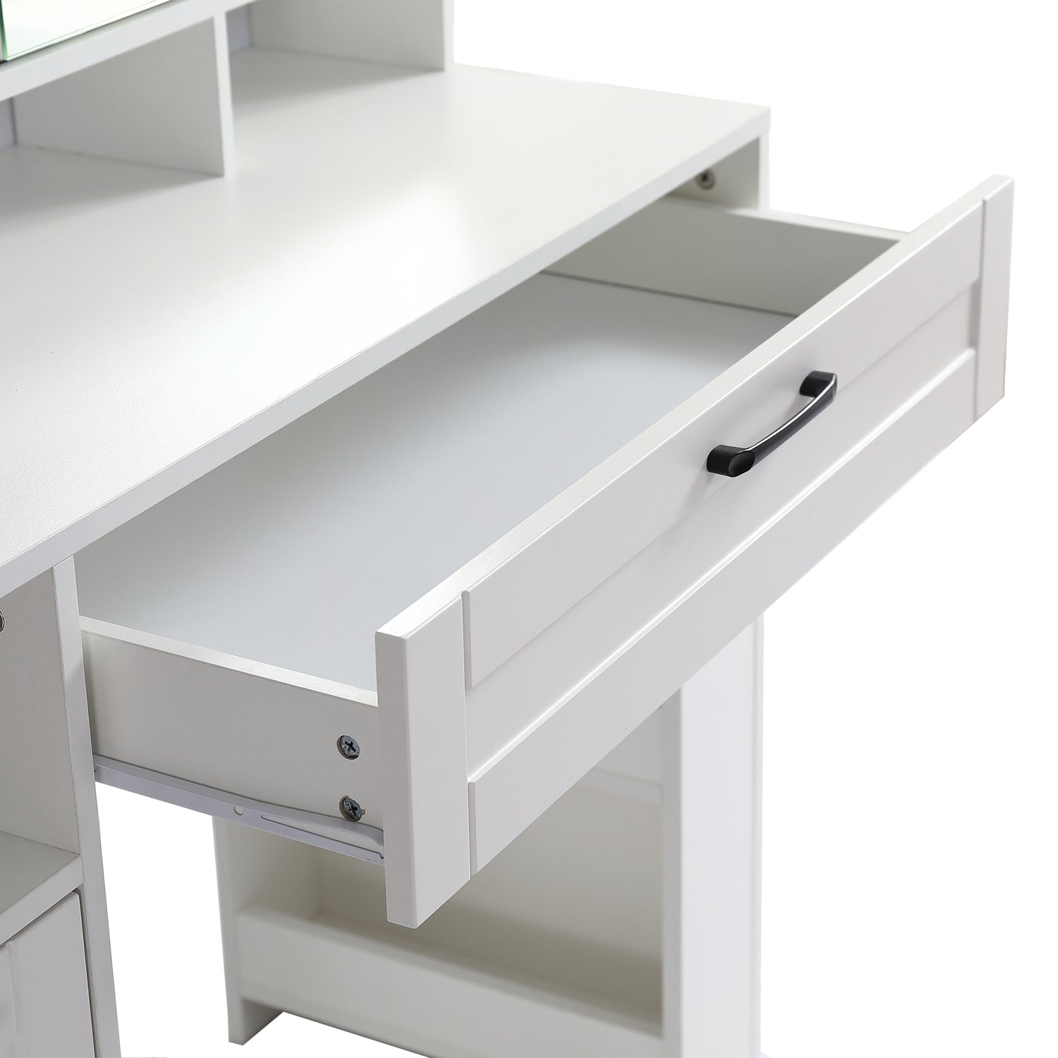 • Powerful Storage Capacity: With 2 deep drawers, 2 side cabinet, and lots of open shelves, this vanity desk offers ample storage space for all your beauty products and tools. This provides ample storage space for your jewelry, hair accessories, and cosmetics so that you can have a tidy desktop. And this dressing table set including upholstered stool.