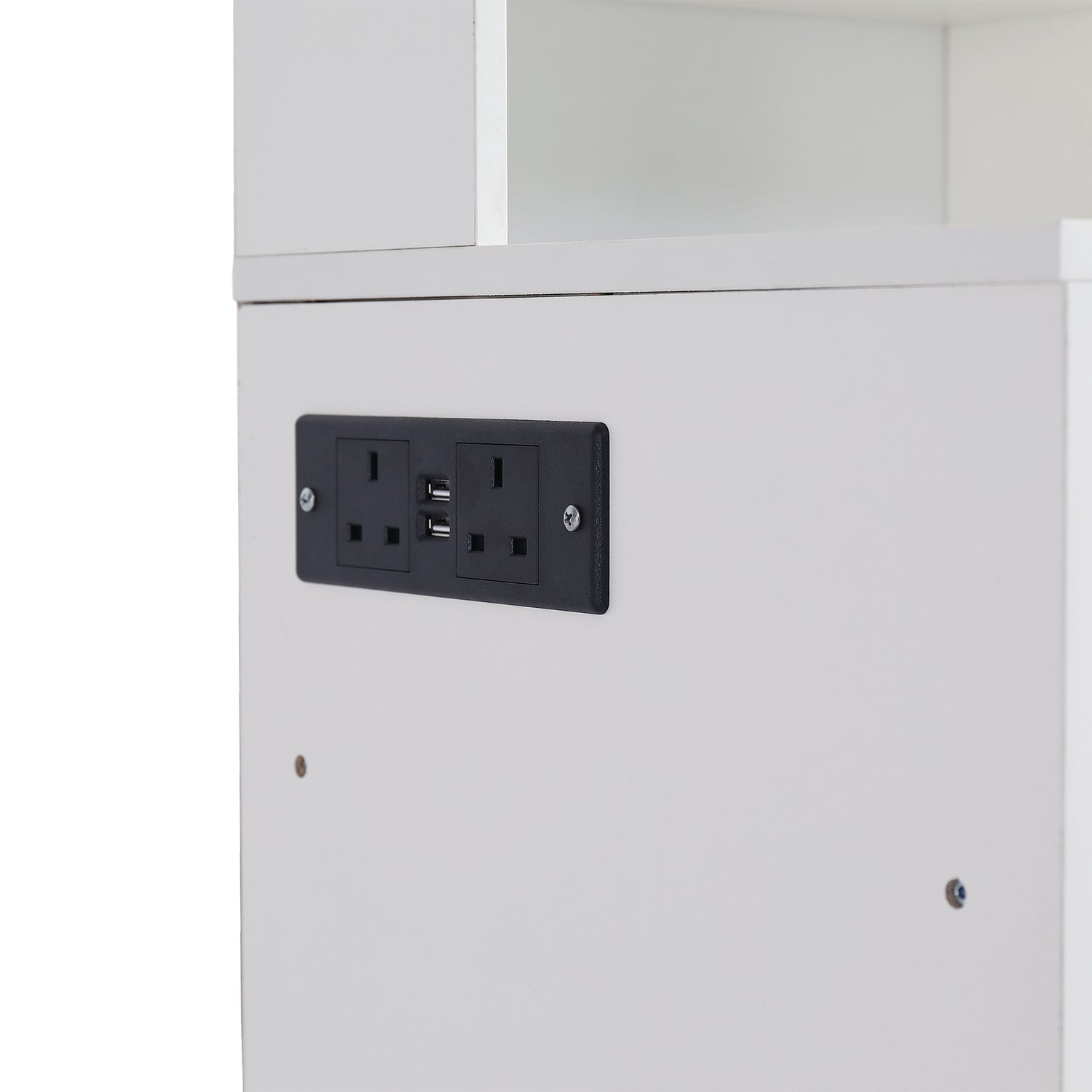 • Vanity Desk with Charging Station: This modern vanity desk comes with a power strip that includes standard plug sockets and USB ports, allowing you to sit at your vanity and use your hair dryer or curling iron within easy reach and charge your phone, tablet, or other electronics.