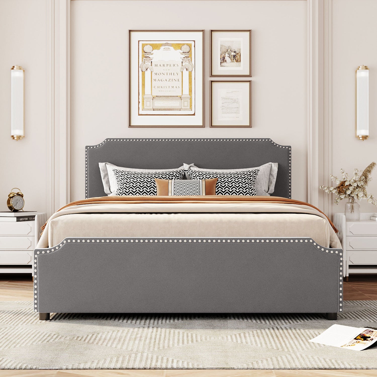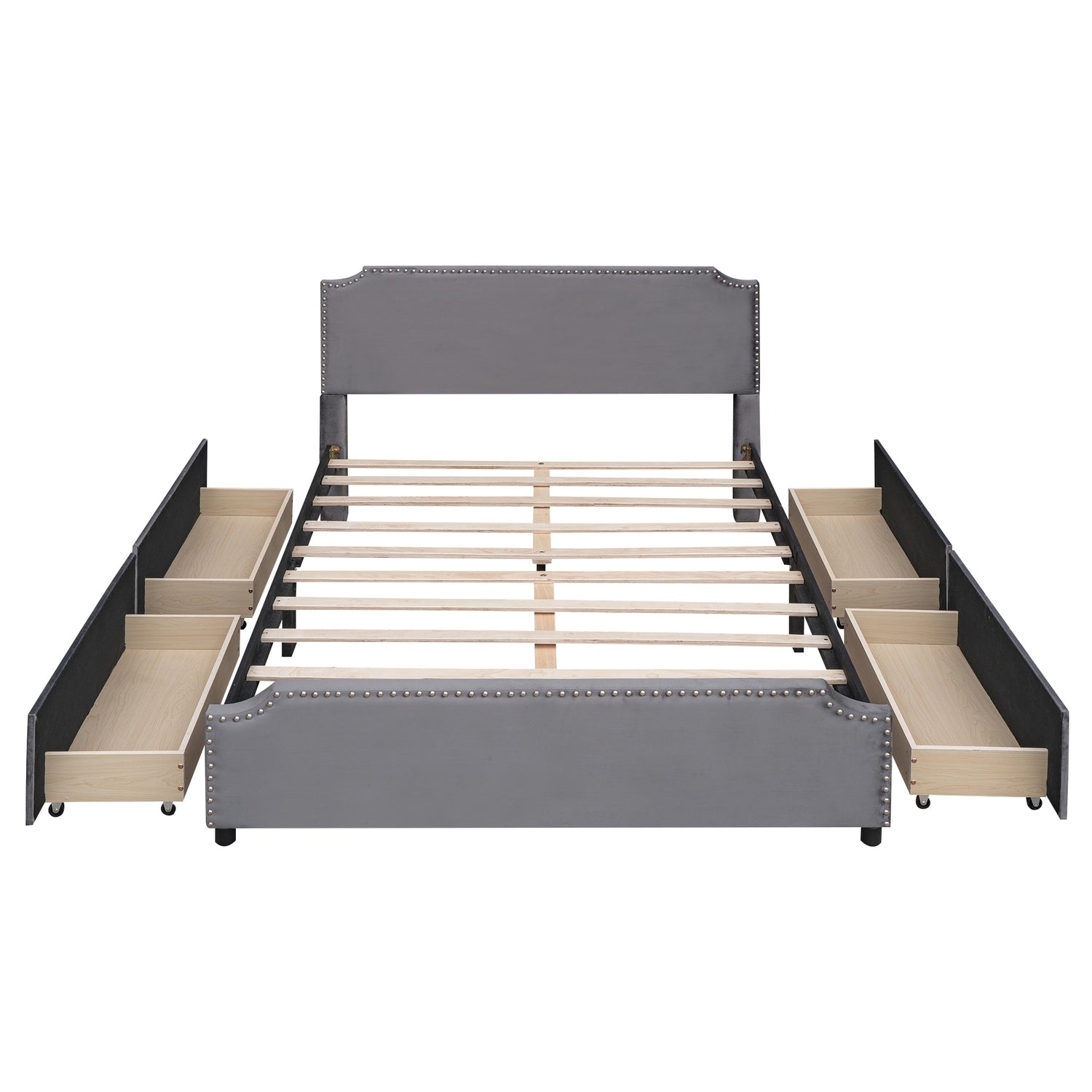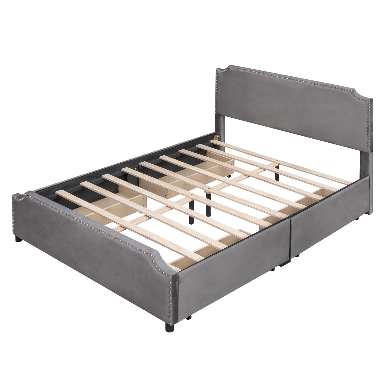 Upholstered Platform Bed with Stud Trim Headboard and Footboard and 4 Drawers No Box Spring Needed, Velvet Fabric, Queen Size (Gray)