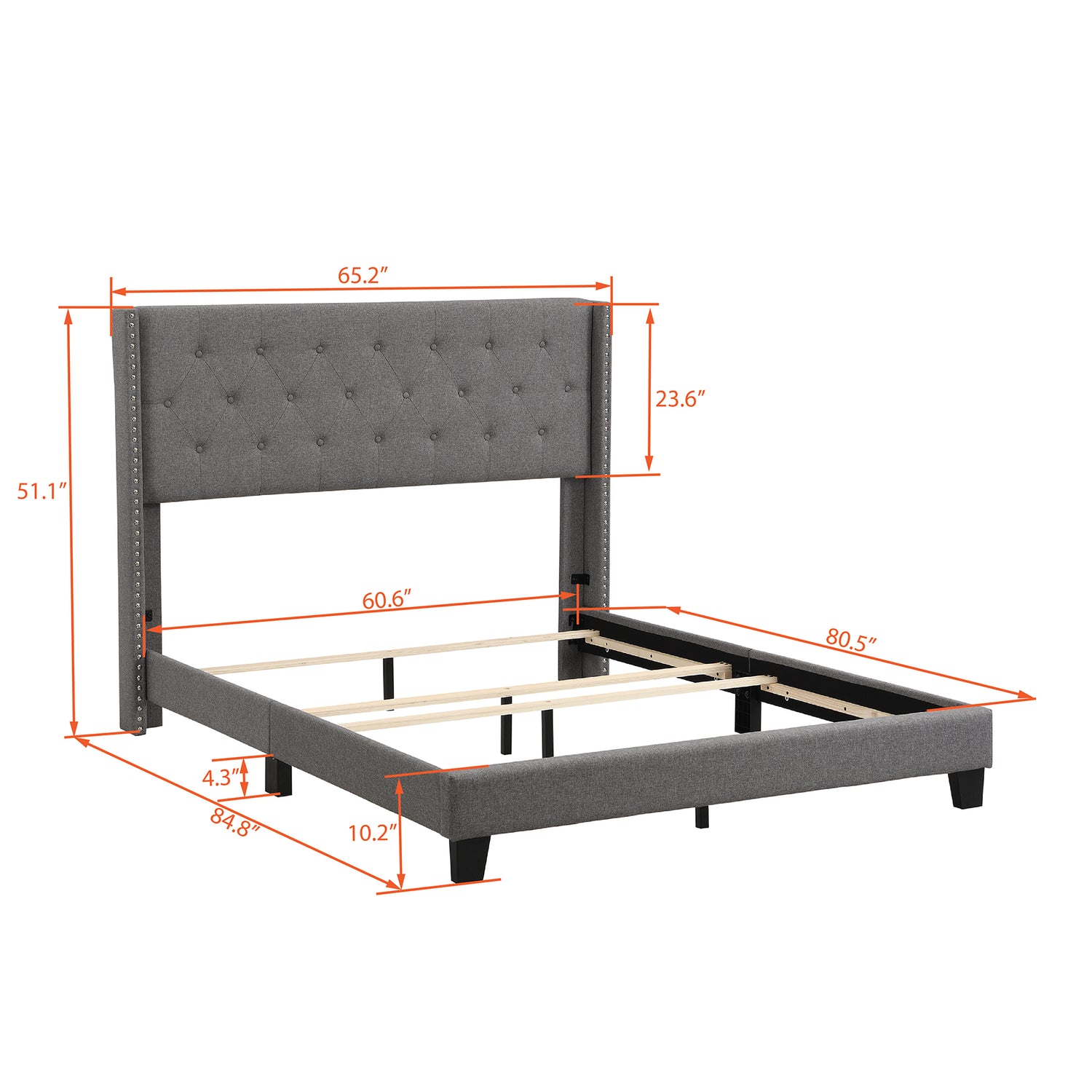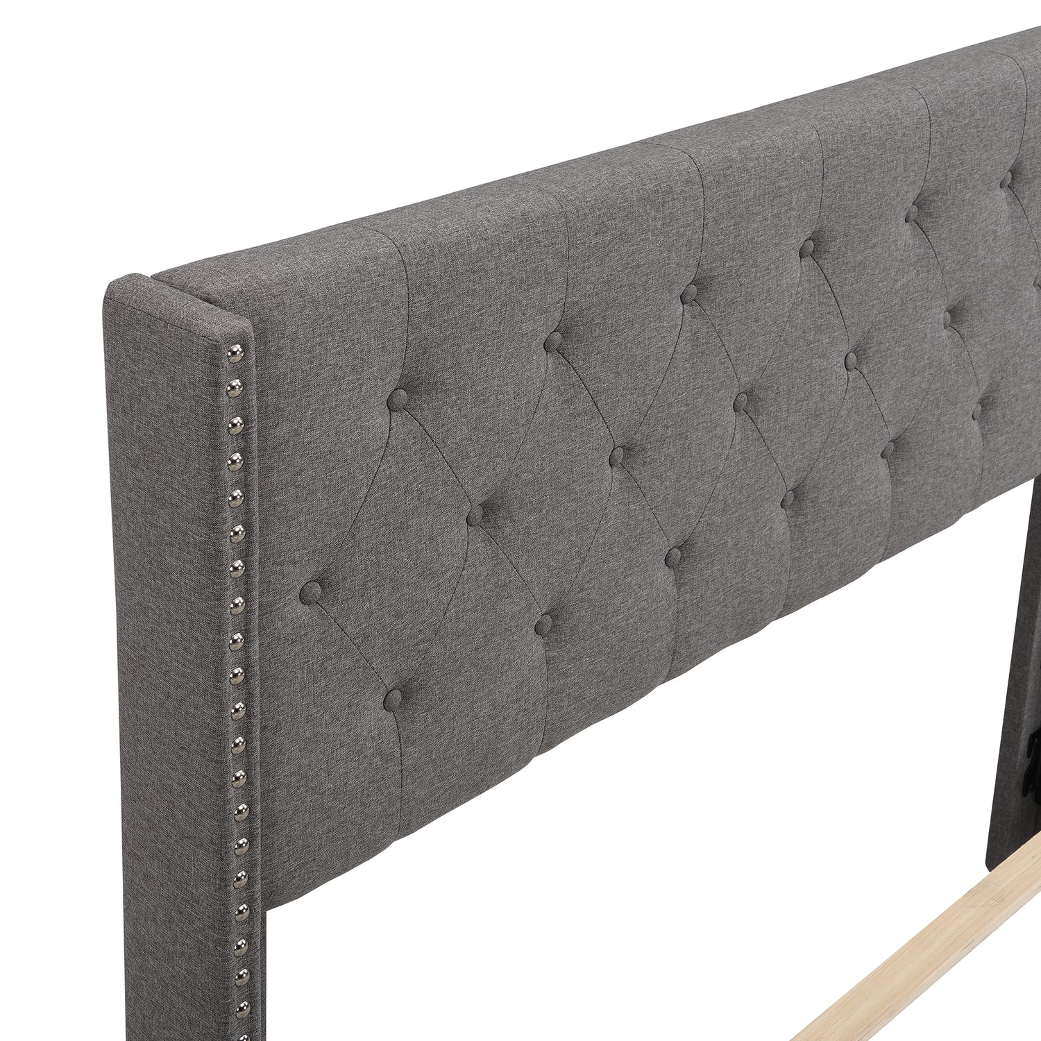 Upholstered Platform Bed with Classic Headboard, Box Spring Needed, Gray Linen Fabric, Queen Size