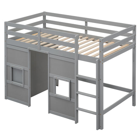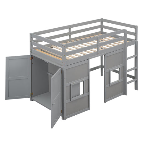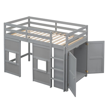 Wood Twin Size Loft Bed with Built-in Storage Wardrobe and 2 Windows, Gray