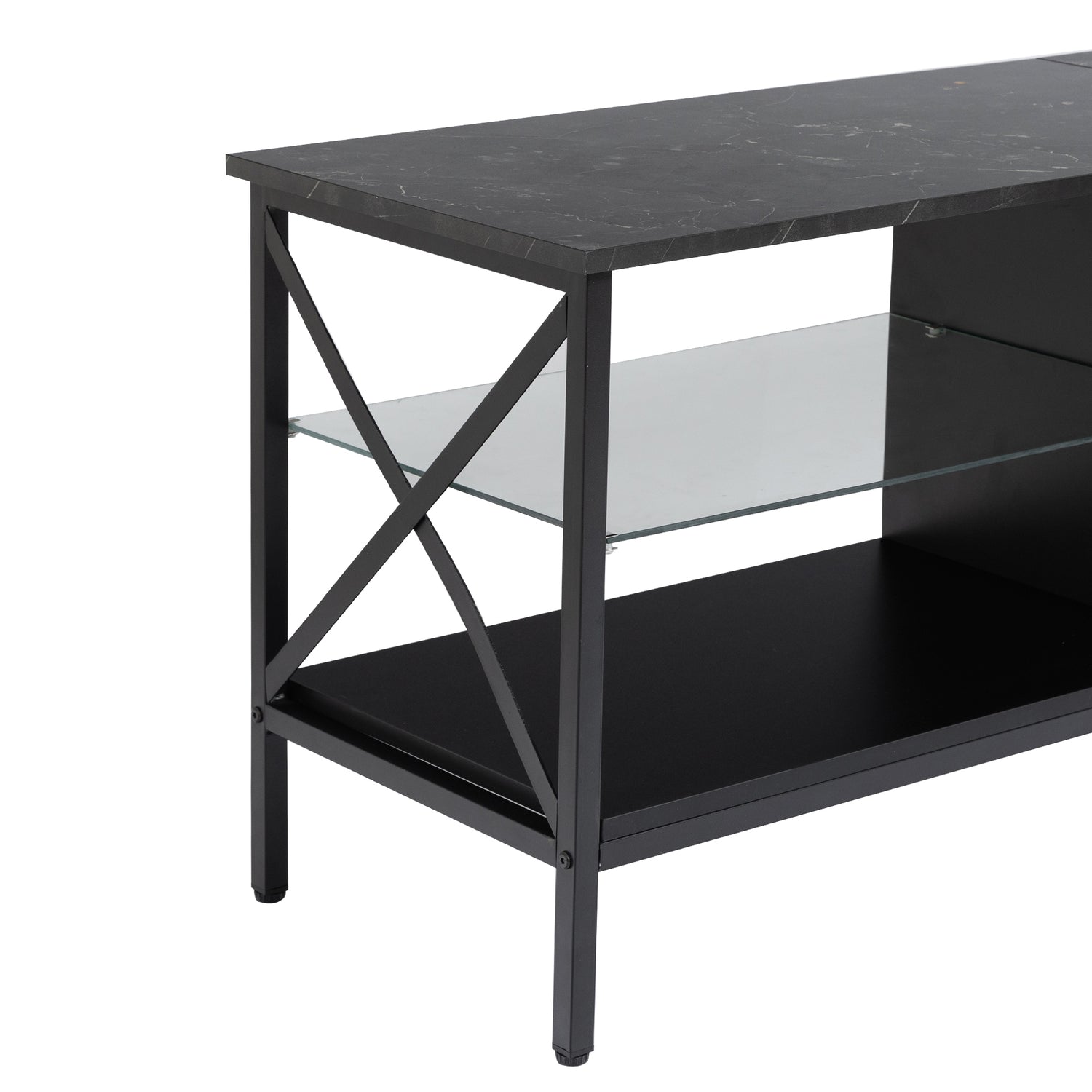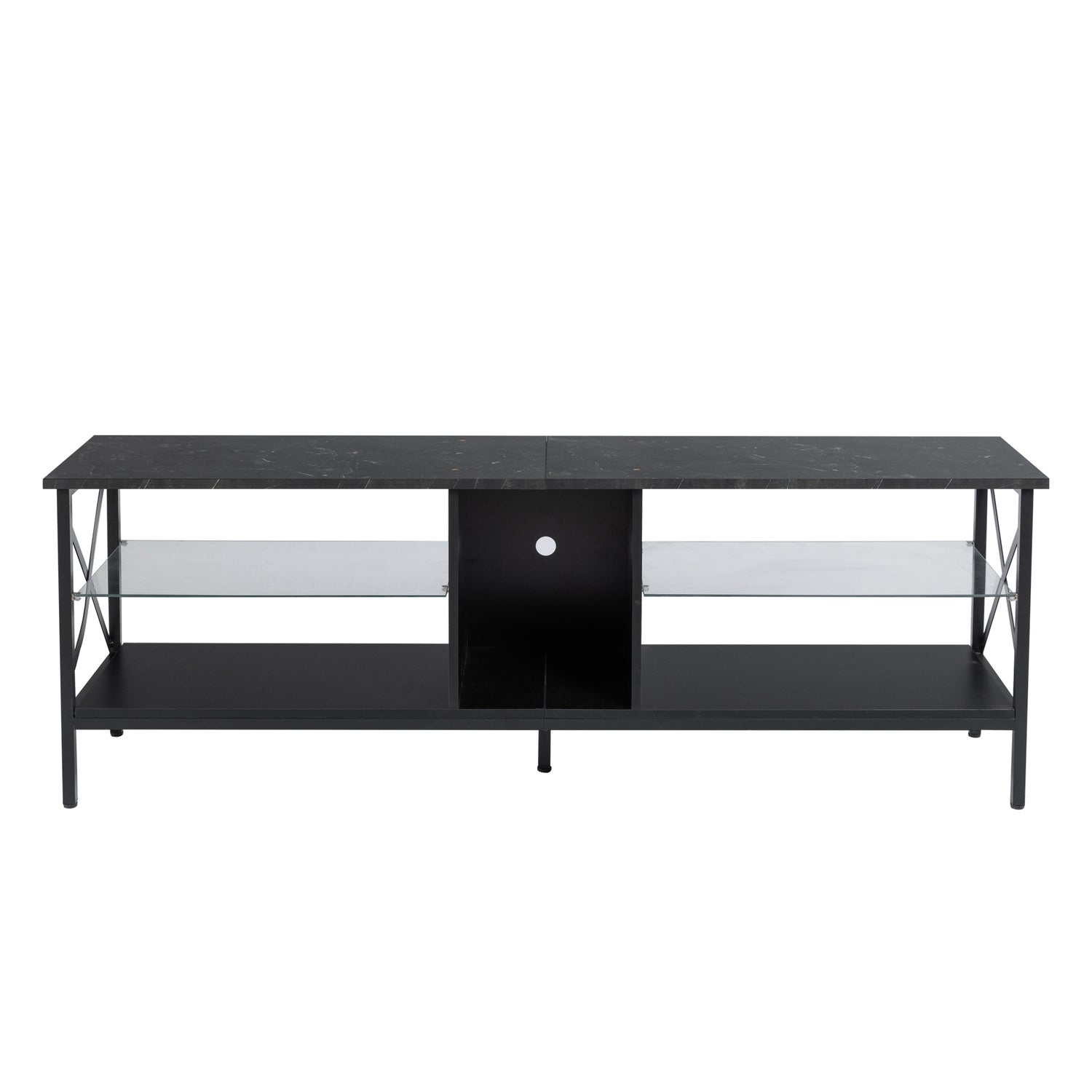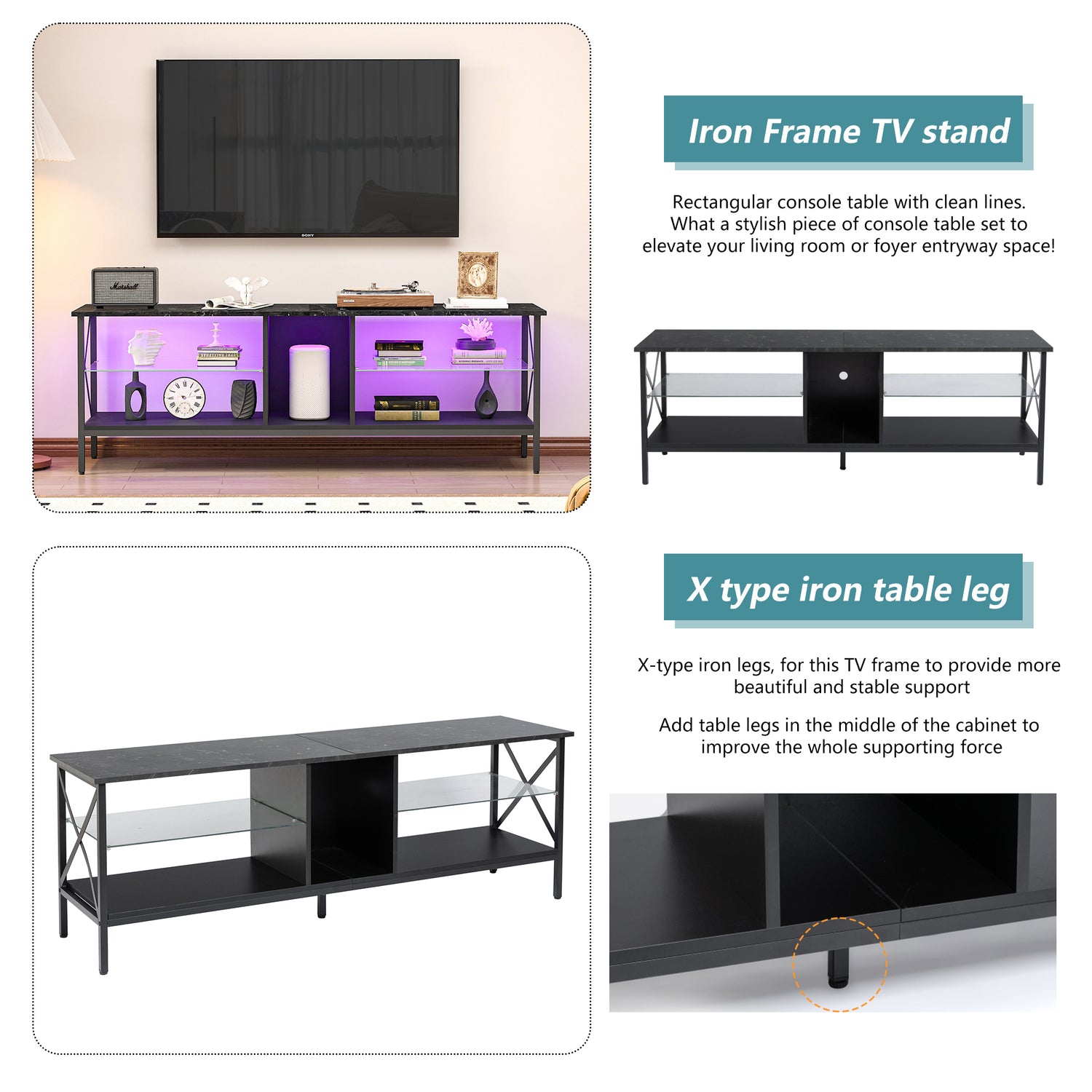 TV stand,Iron TV cabinet,entertainment center, TV set, media console, with LED lights, remote control,toughened glass stand,can be placed in the living room, bedroom, color:black with marble texture