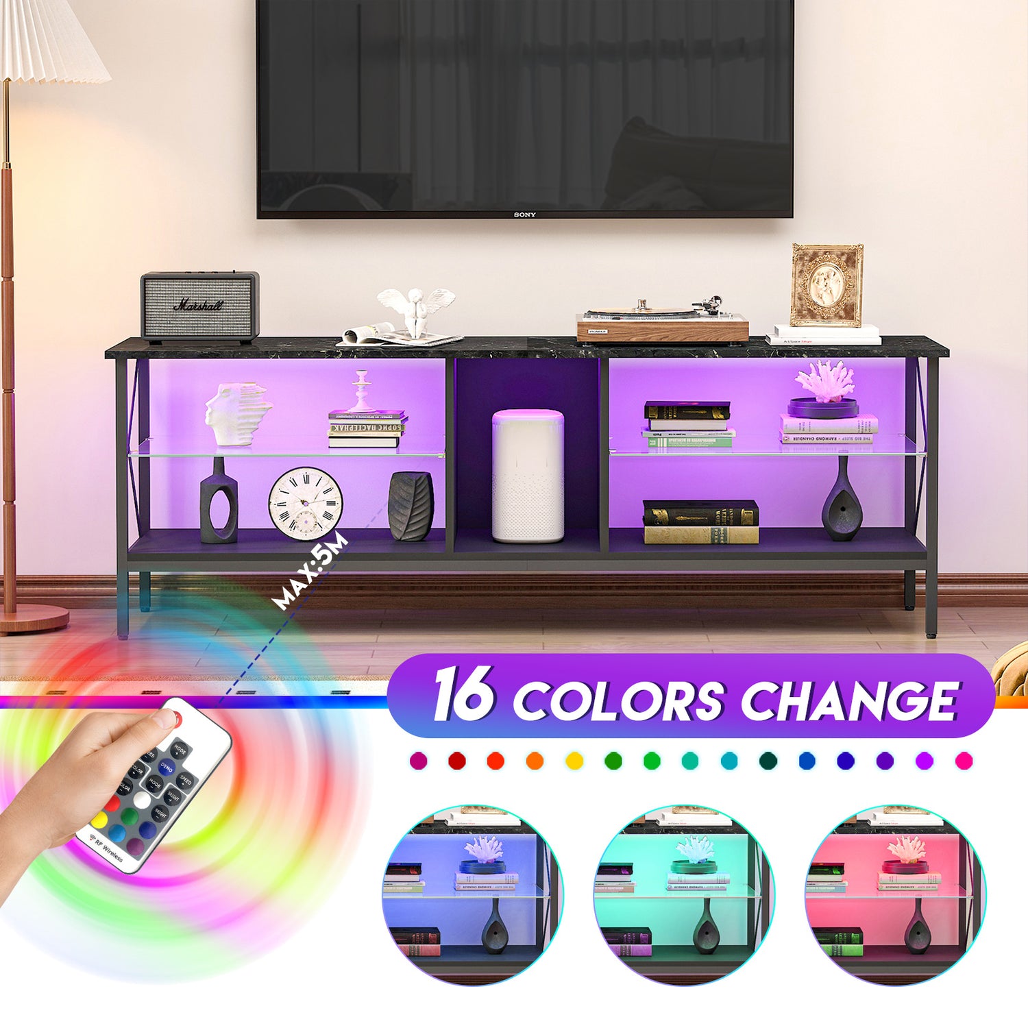 - This TV stand with LED comes with 16 RGB LED BACKLIGHT, 4 LIGHT MODE & BRIGHTNESS ADJUSTMENTS.Equipped with REMOTE CONTROL makes changes of light ever easy.
