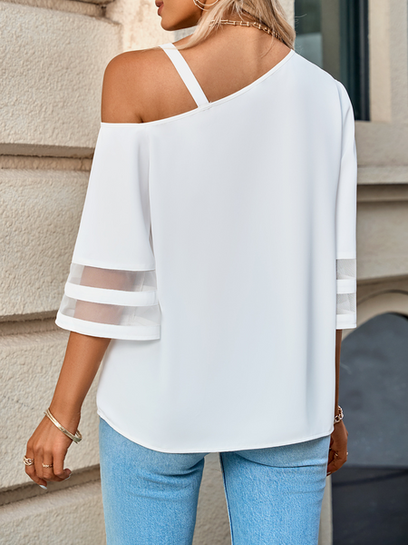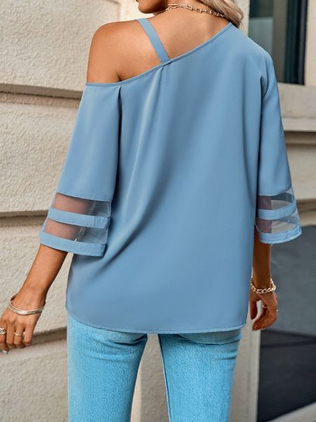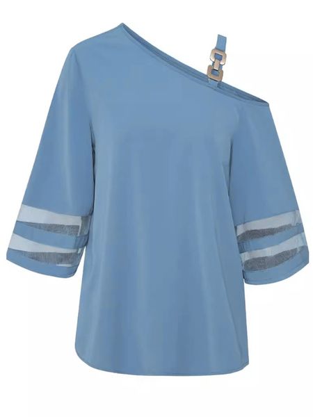 Women's Casual Top Solid Color Metal Buckle Strap Mesh Bell Sleeve One Shoulder Top HFBCTPSKC4