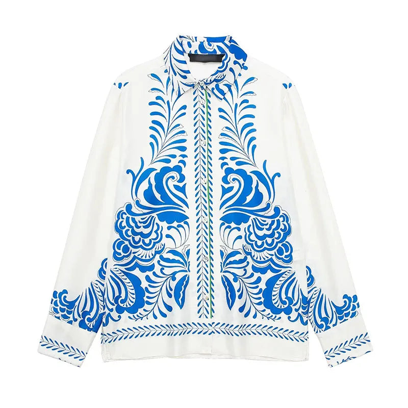 TRAFZA Women Pants Set Print Turn-Down Collar Long Sleeves Single Breasted Casual Shirts+High Waist Pocket Zipper Wide Leg Pant - blue suit / L is backordered and will ship as soon as it is back in stock.