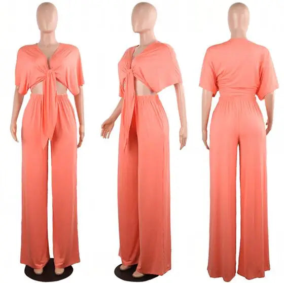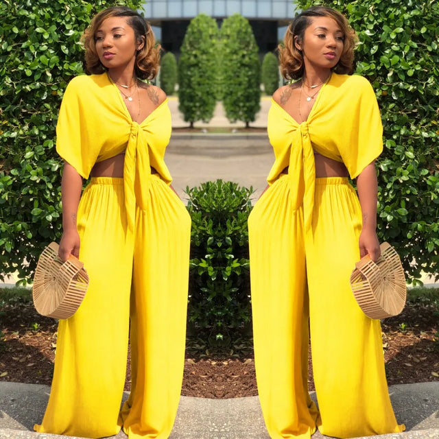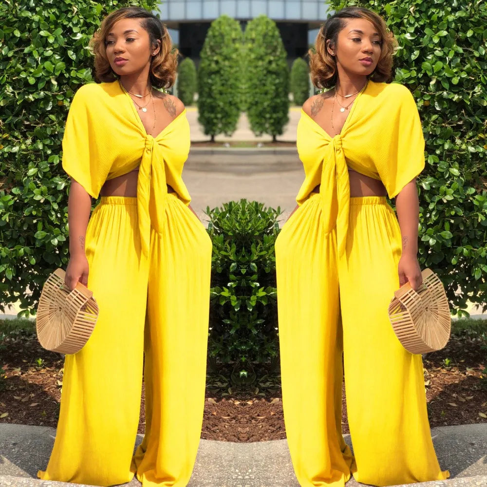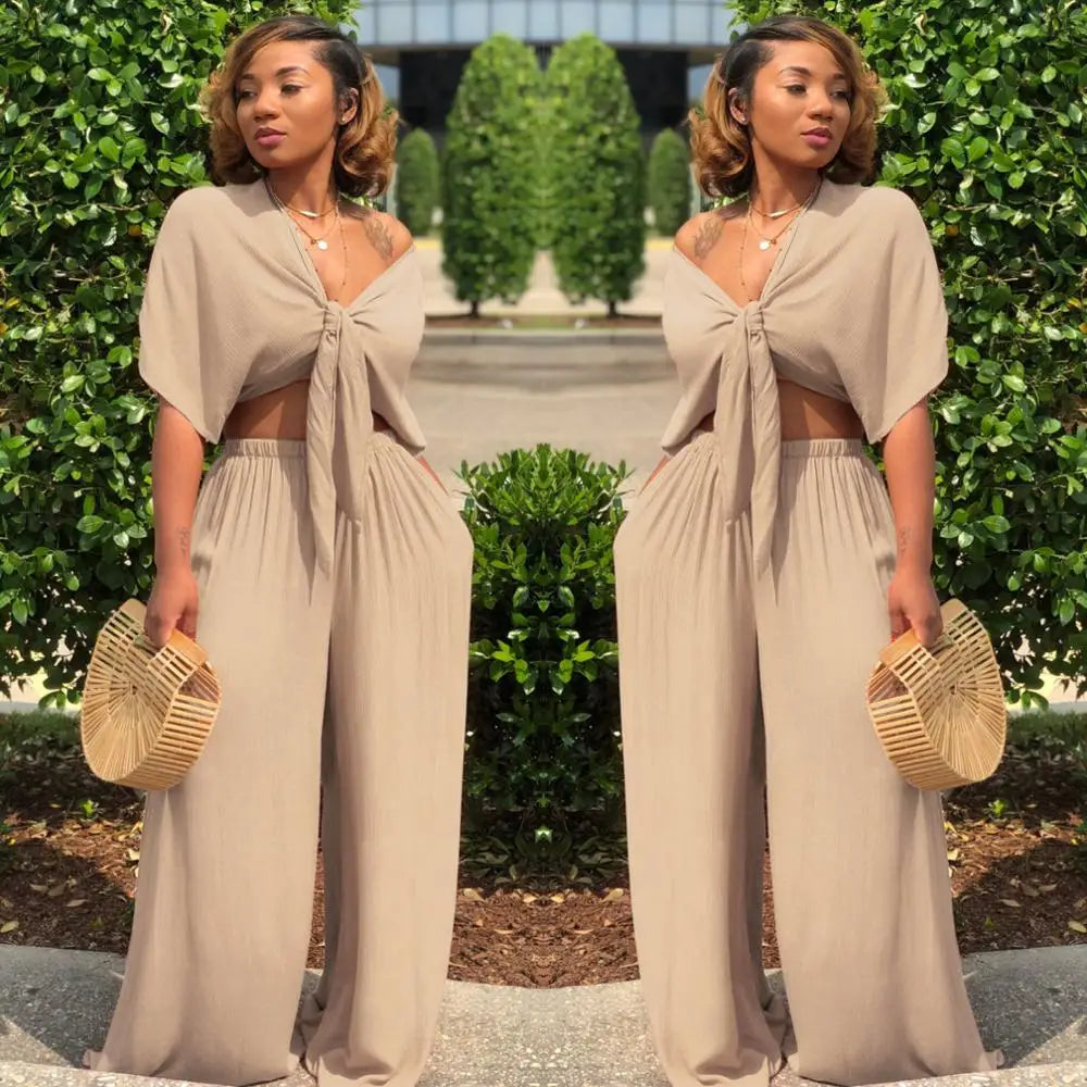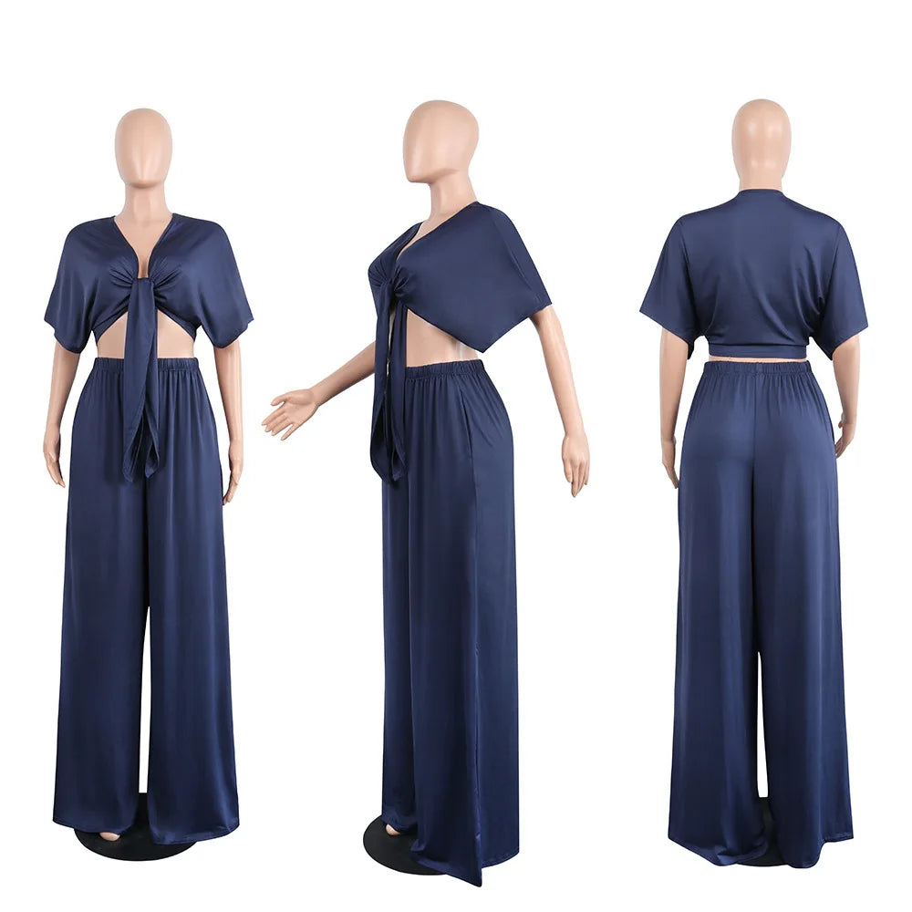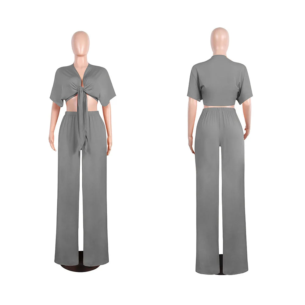Women loose wide leg pants bandage lace up crop top 2 piece set for female women v-neck short sleeve two piece set women's suits - 02 / XL is backordered and will ship as soon as it is back in stock.