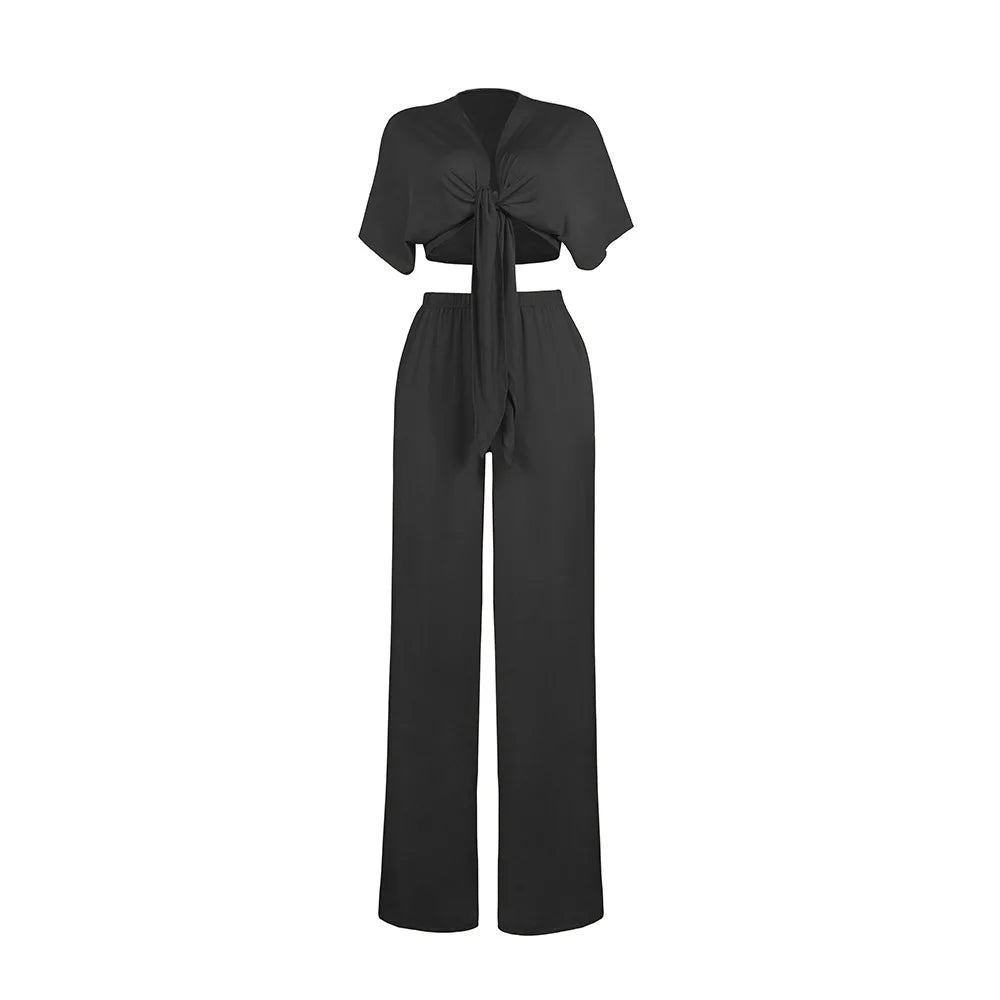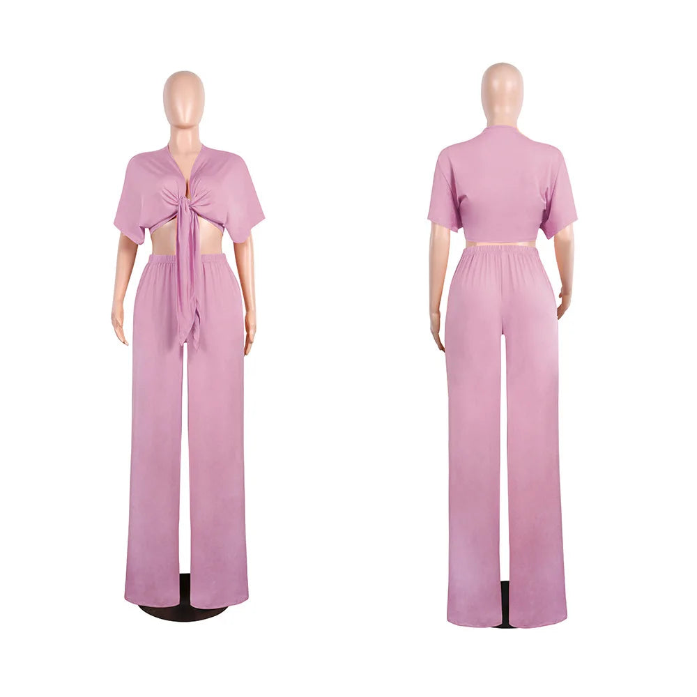 Women loose wide leg pants bandage lace up crop top 2 piece set for female women v-neck short sleeve two piece set women's suits
